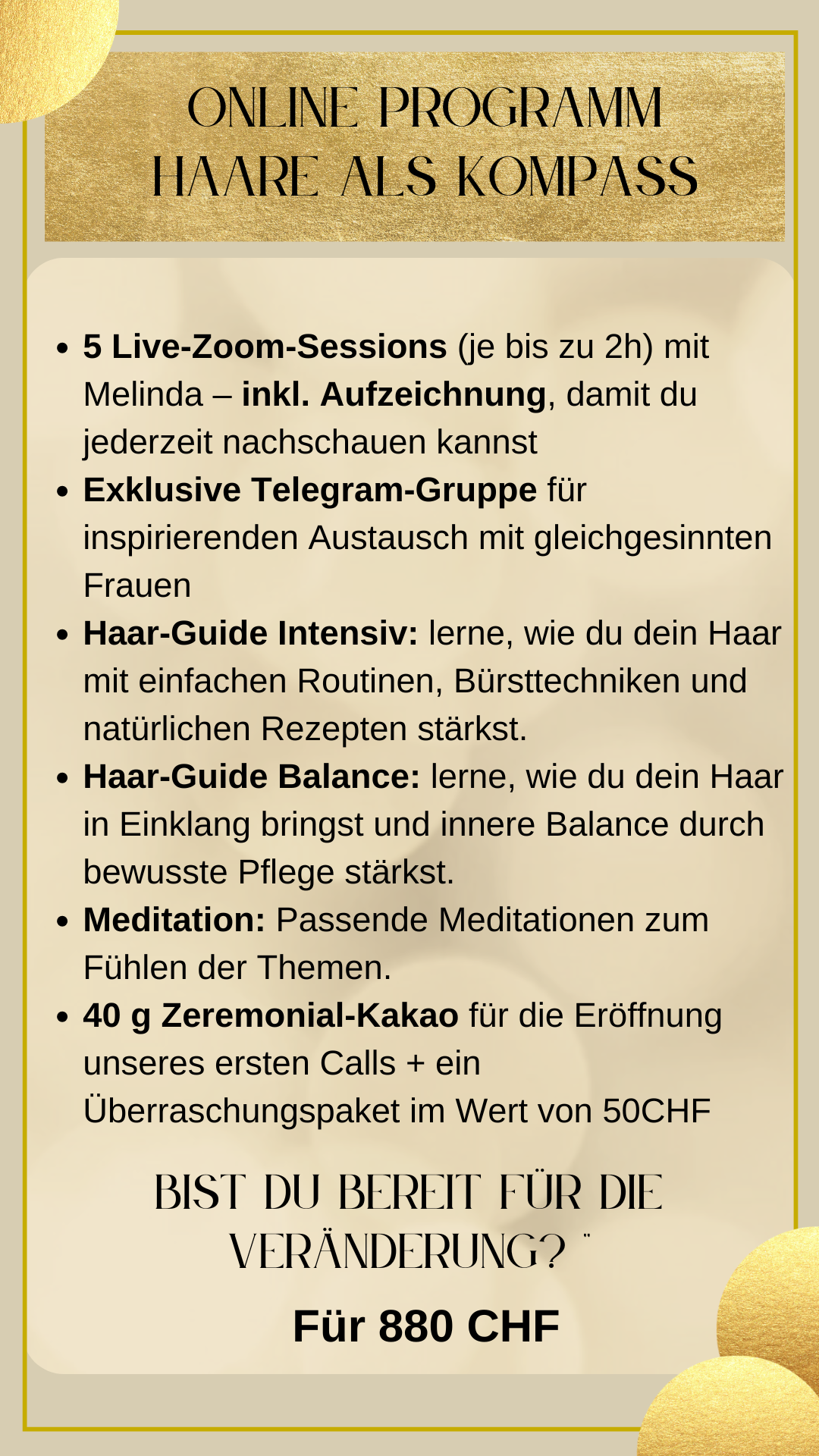 In diesen 5 Wochen gibt es auch eine Telegram-Gruppe, in der du dich mit den anderen Frauen austauschen, deine Gedanken teilen und Erfolge feiern kannst. Du bist Melinda, der Gründerin von Haare als Kompass, ganz nahe, kannst jederzeit Fragen stellen und erhältst wertvolle Impulse.